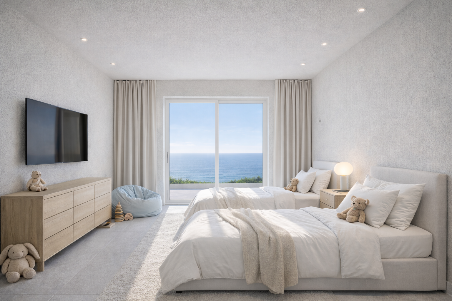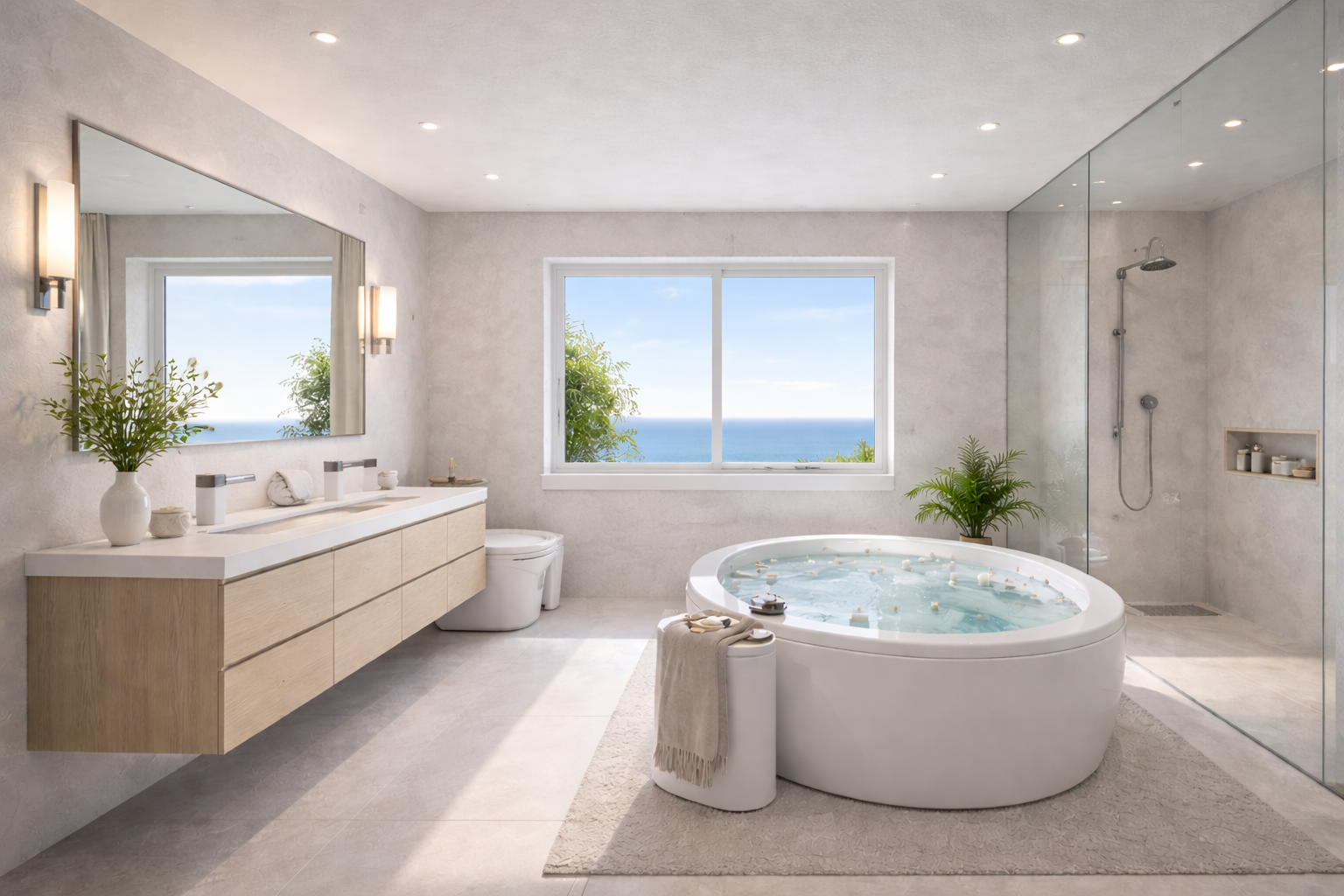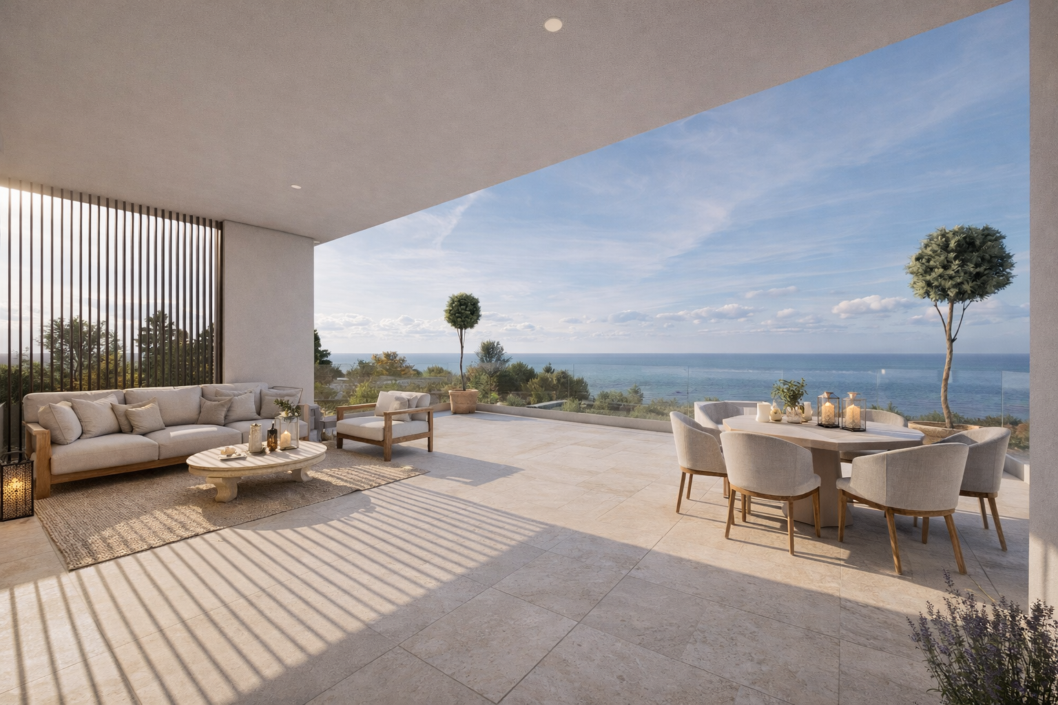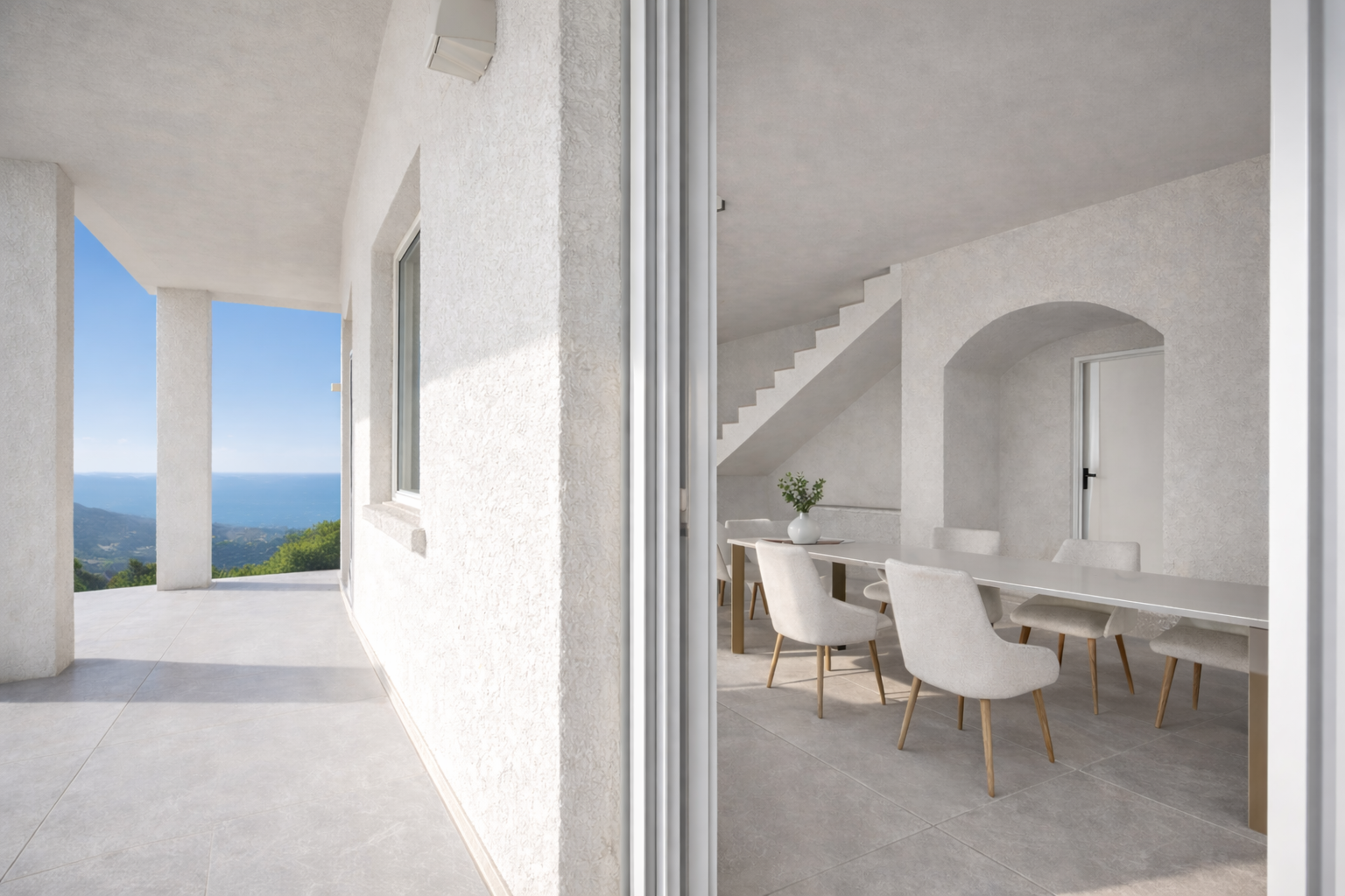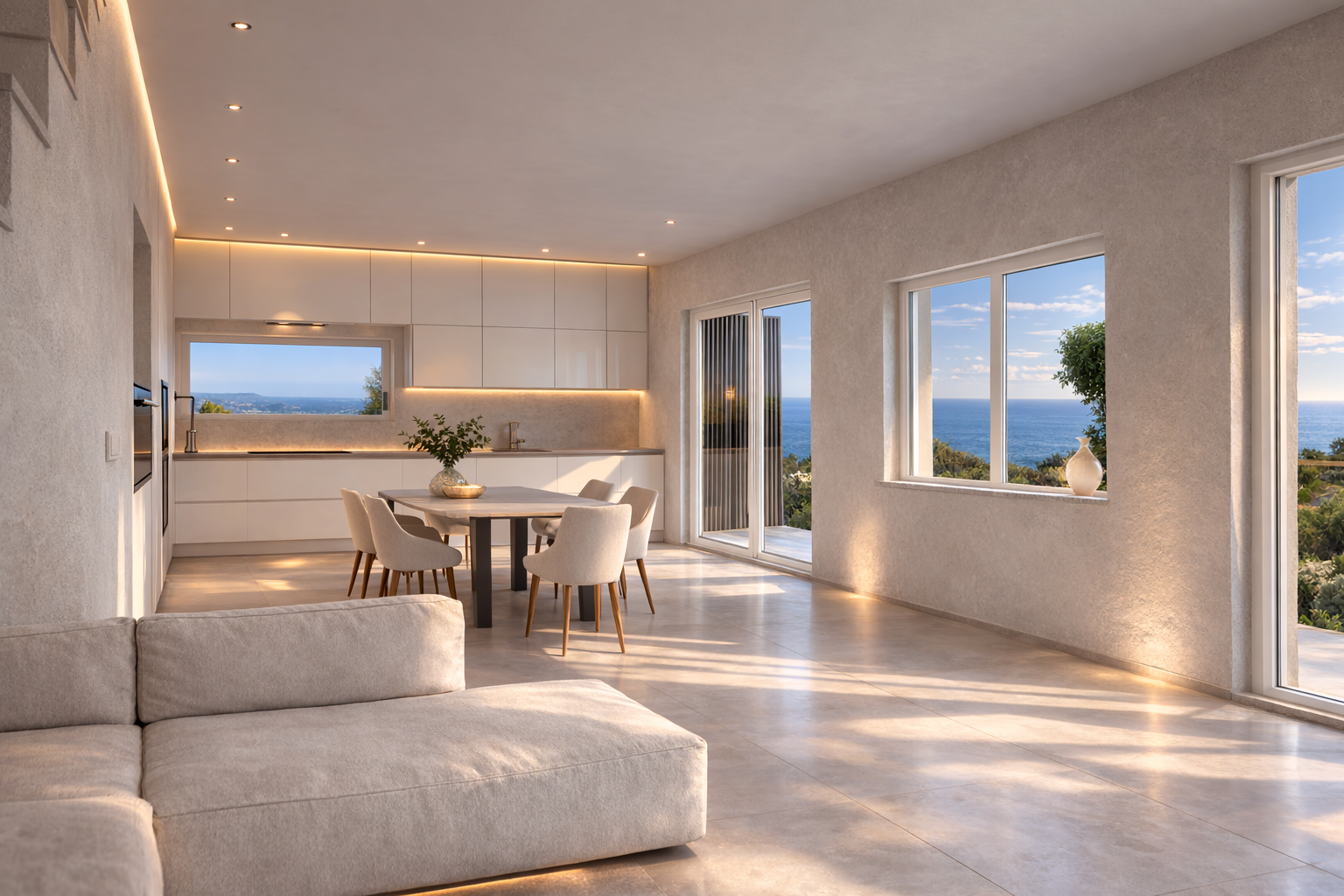 Velké prosklené plochy propojují obytné prostory s venkovní terasou a nabízejí nádherný výhled na moře.