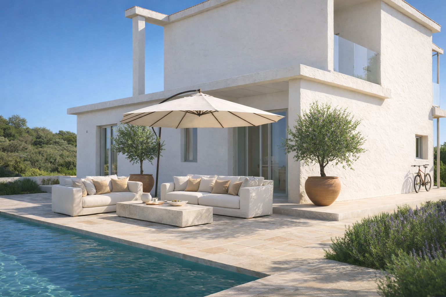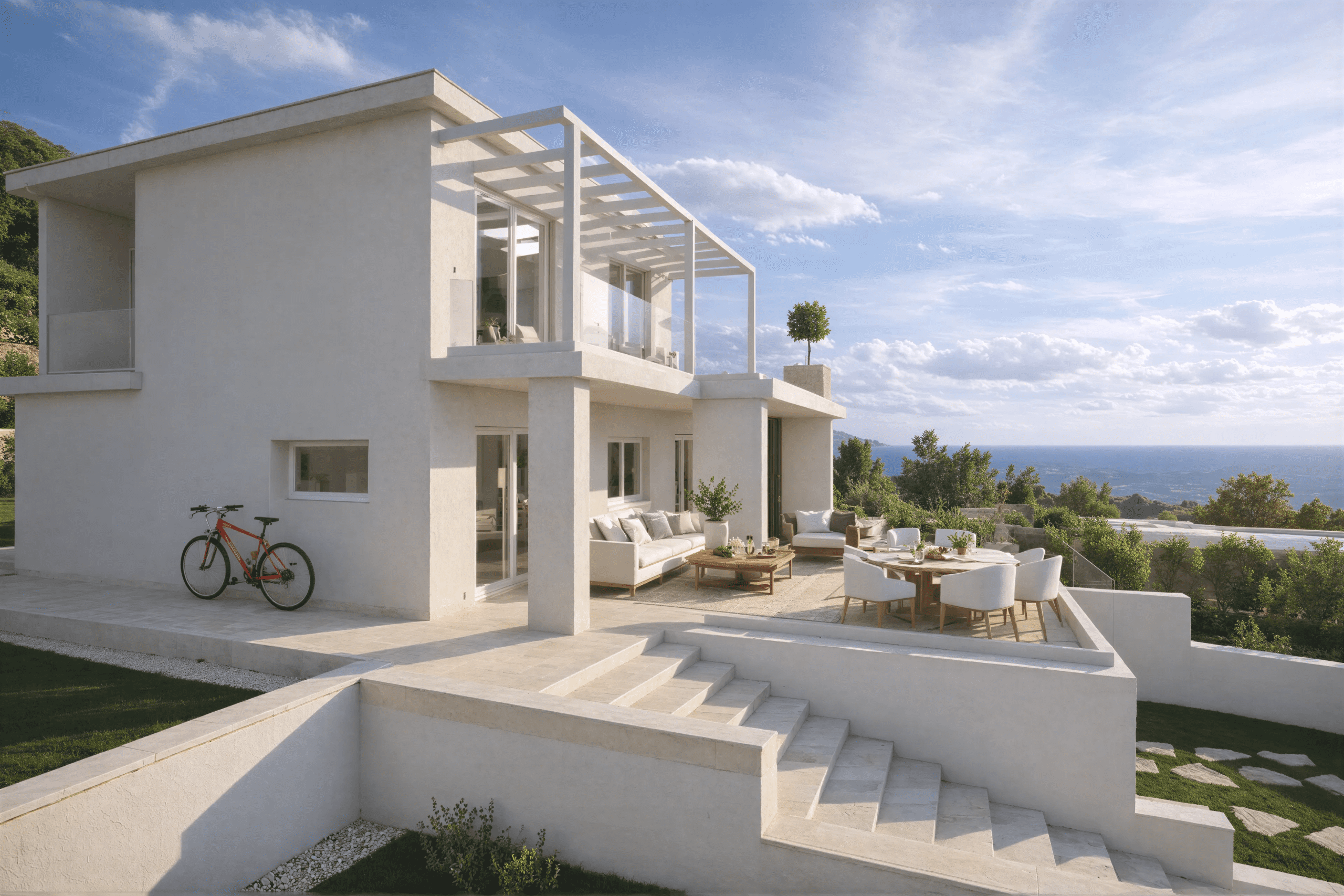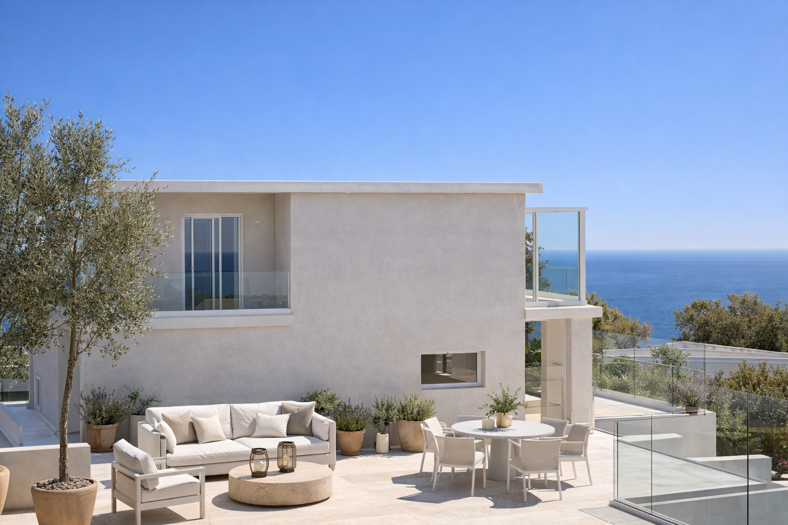 Architektura kombinuje čisté moderní linie s tradičním středomořským stylem.
